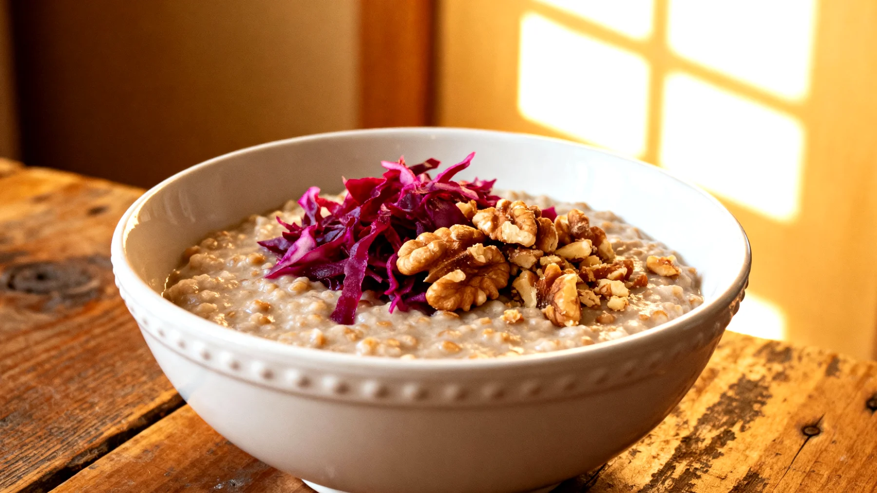 Der fermentierte Rotkohl liefert zudem Vitamin C und Anthocyane – antioxidative Pflanzenstoffe, die Entzündungsprozesse reduzieren können. Wichtig ist jedoch: Den Rotkohl niemals mitkochen, da Hitze die empfindlichen Probiotika zerstört. Erst beim Servieren über das warme Porridge geben.