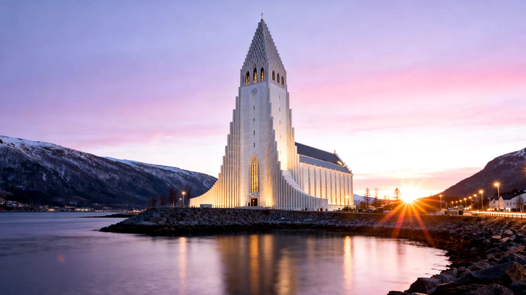Die Eismeerkathedrale ist ein architektonisches Meisterwerk, das von außen kostenlos bewundert werden kann. Das imposante Gebäude mit seiner charakteristischen dreieckigen Form spiegelt sich bei Dämmerung spektakulär im Wasser. Der Eintritt ins Innere kostet etwa 7 Euro und lohnt sich für das farbenfrohe Glasmosaik.